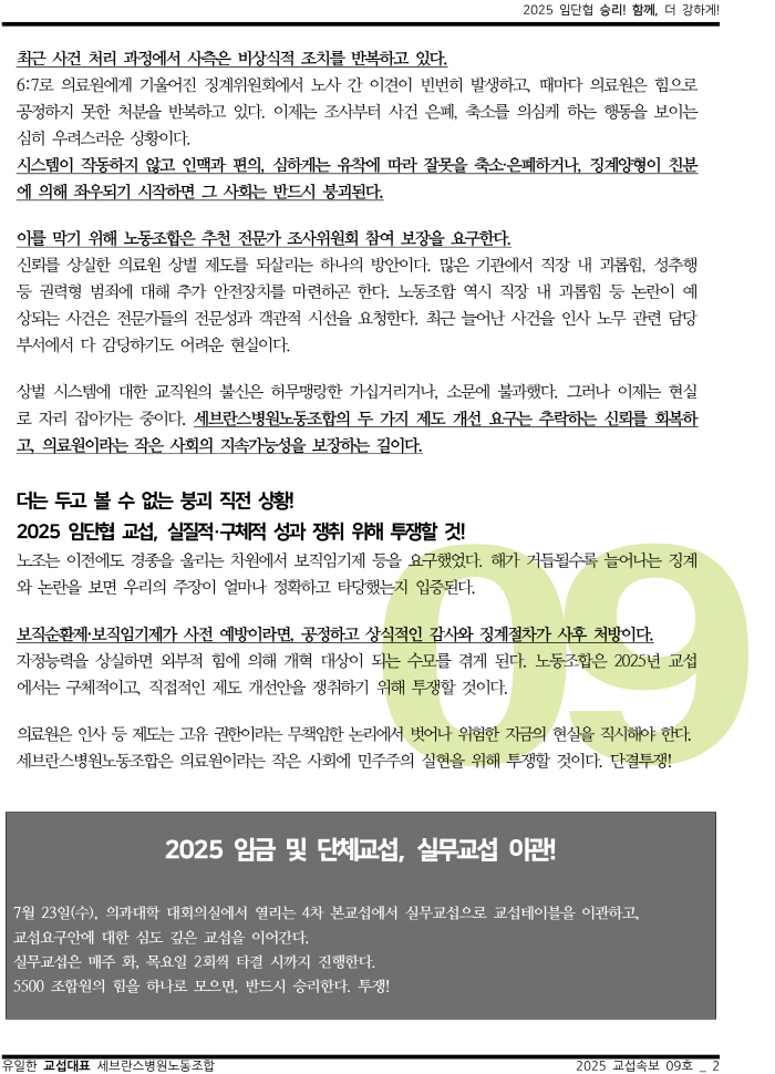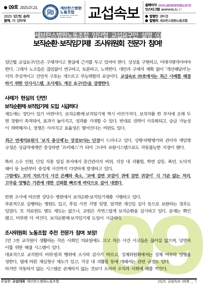 [2025. 교섭속보 09호]요구안 설명4_보직순환 보직임기제 등(25.07.23.) [2025. 교섭속보 10호]요구안 설명5_리프레시휴가 개선, 유니온숍 쟁취(25.07.29.) [2025. 교섭속보 08호]칼럼_요구한 적 없는 요구안(25.07.22.) Views: 71 노동조합2025-08-14T10:13:02+09:008월 14th, 2025| 댓글을 남겨주세요 응답 취소로그인 후 댓글을 작성할 수 있습니다.